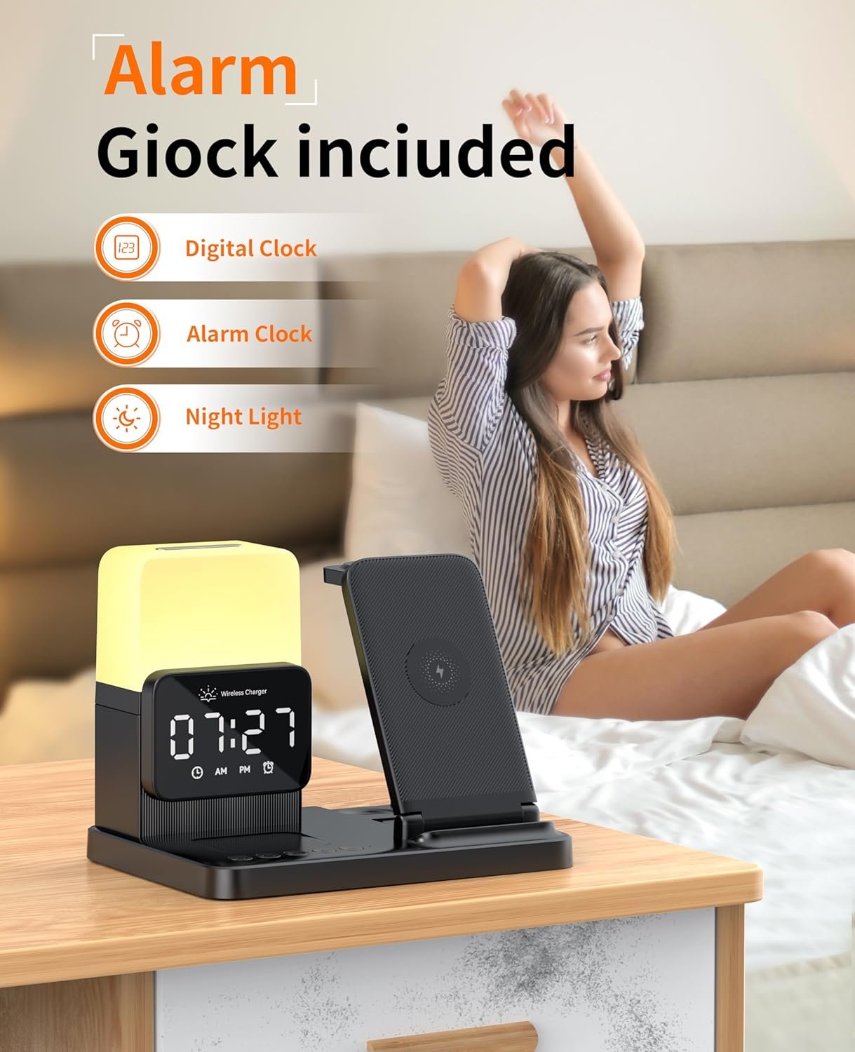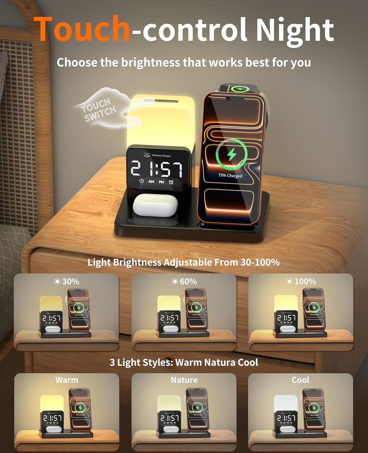 Digital Alarm Clock & Night Light: This wireless charger features a digital alarm clock and a customizable night light. Customize your space with adjustable warm/cool lighting. Light Brightness Adjustable offering three brightness levels (30%-60%-100%) Long press to adjust brightness.- perfect for creating the right ambiance in your domestic use areas.For alarm settings, please see the tutorial on the product details page