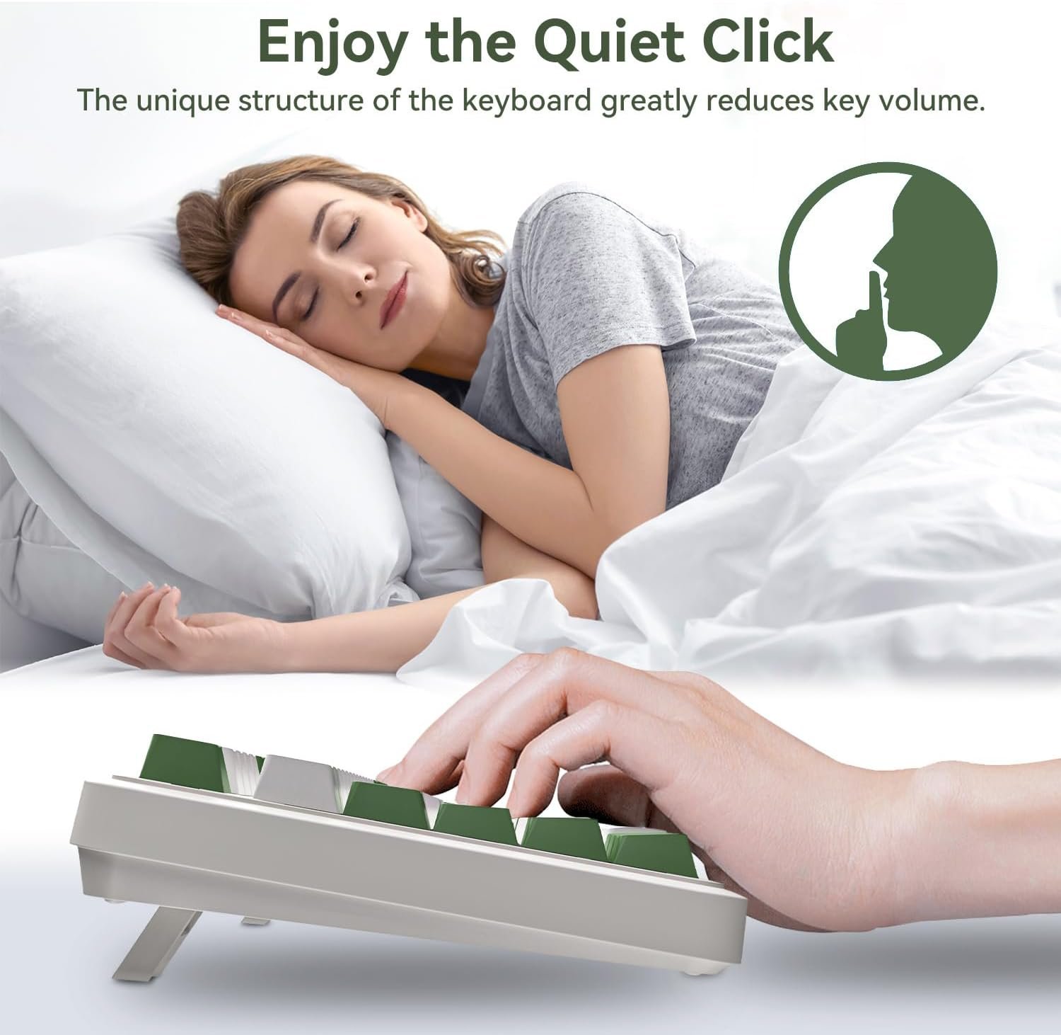 No, this silent keyboard is not pure white; The color is light beige& green. Made of PBT material, it is wear-resistant and oil-resistant, durable and comfortable to the touch.