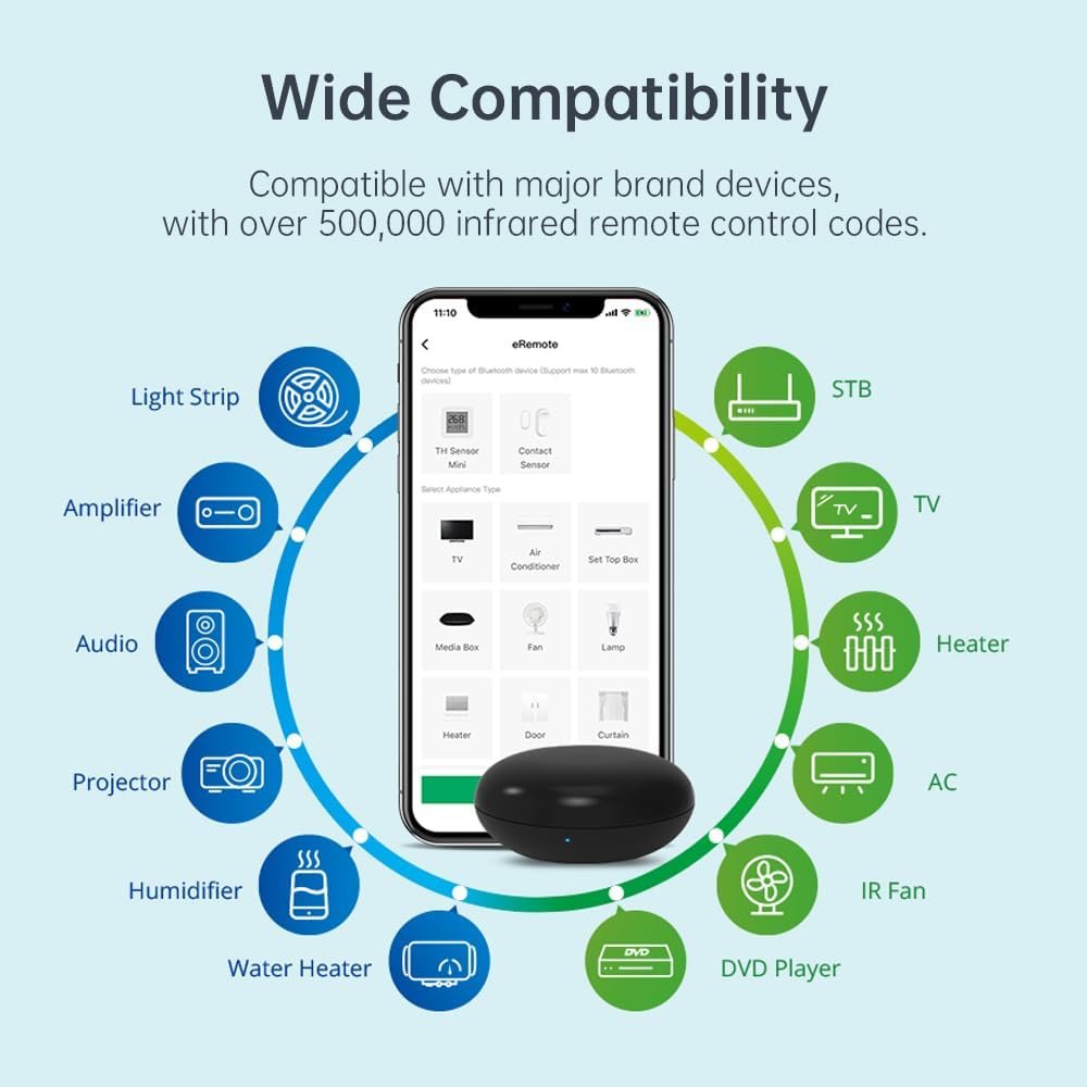EASY SETUP AND USE – eRemote HA only supports 2.4GHz Wi-Fi connection(not 5GHz). However, during setup, your phone can be connected to either 5GHz Wi-Fi or even a cellular network for maximum convenience. With an ultra-wide IR signal range of up to 12m, it can cover a large room. In most cases, you don’t even need to point the device directly at the IR receiver, as the signals can be reflected off walls, providing seamless control from any angle.