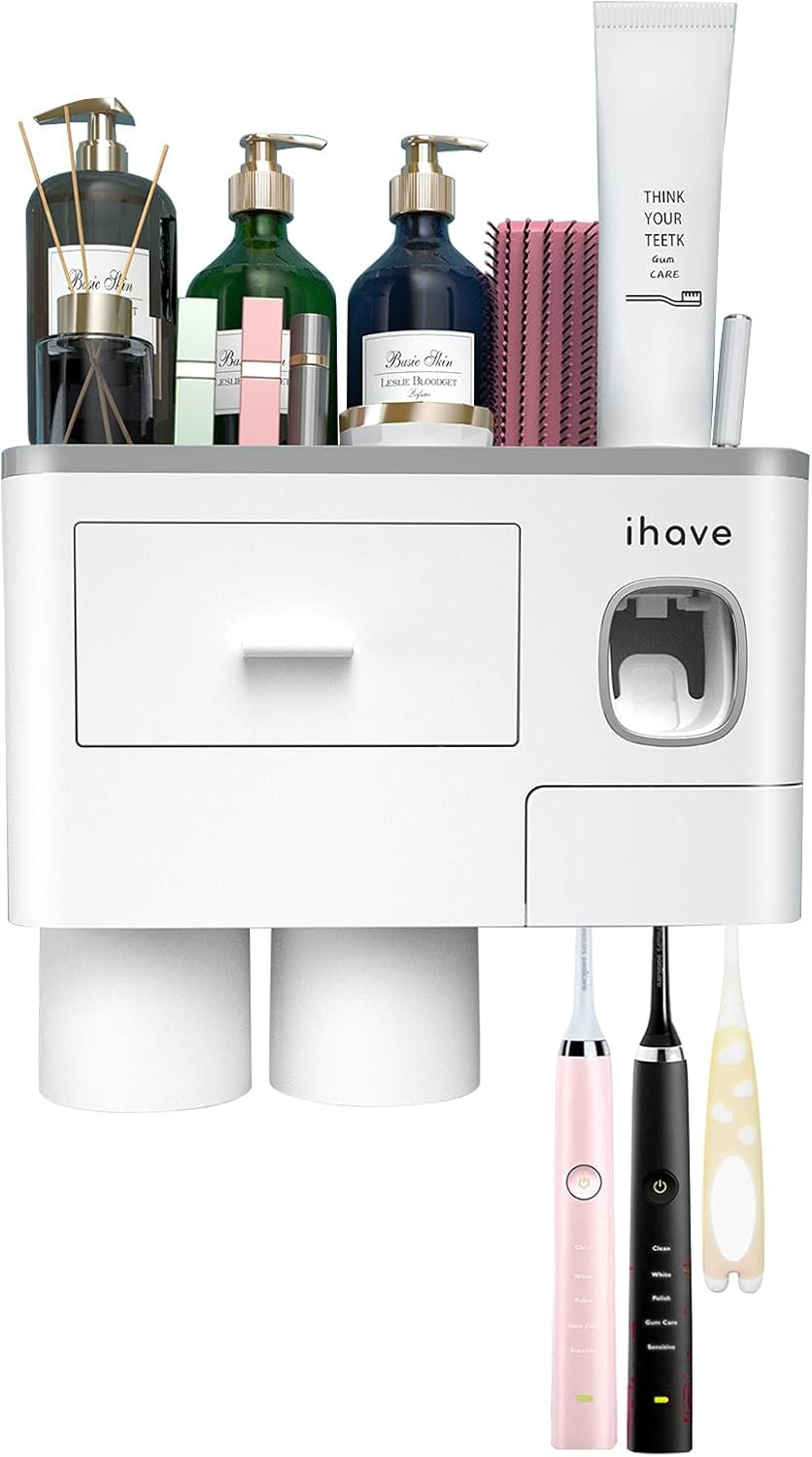 iHave Toothbrush Holders for Bathrooms, 2 Cups Toothbrush Holder Wall Mounted with Toothpaste Dispenser – Large Capacity Tray, Cosmetic Drawer – Bathroom Decor & Bathroom Accessories