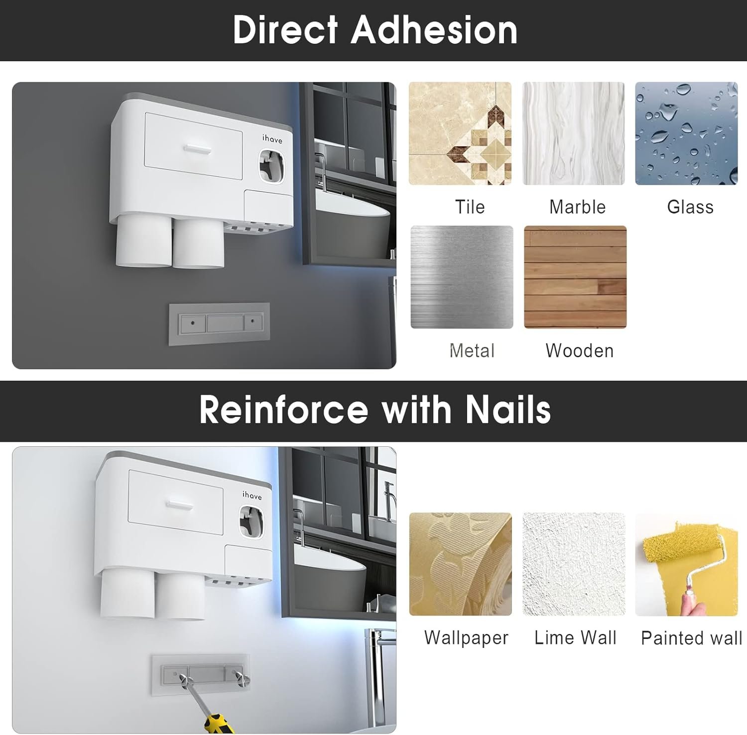 Sturdy: Our toothbrush holder wall mounted uses a patented non-marking adhesive strip with an excellent caulking effect in humid environments, making it firmly bonded regardless of metal, wood, mirror, ceramic tile, or marble. If the wall is uneven, painted, or wallpaper, we have prepared nails for you to drill and reinforce the mounting. This adaptable design makes it a versatile solution for any home.