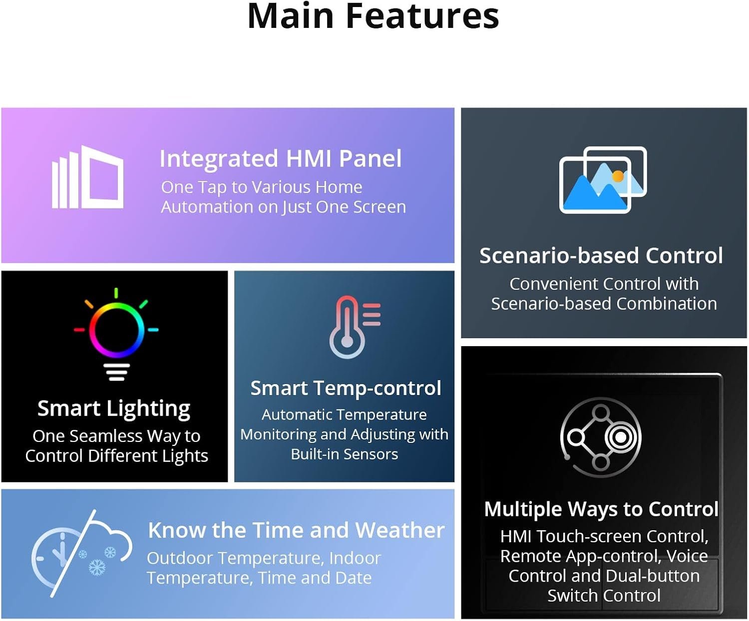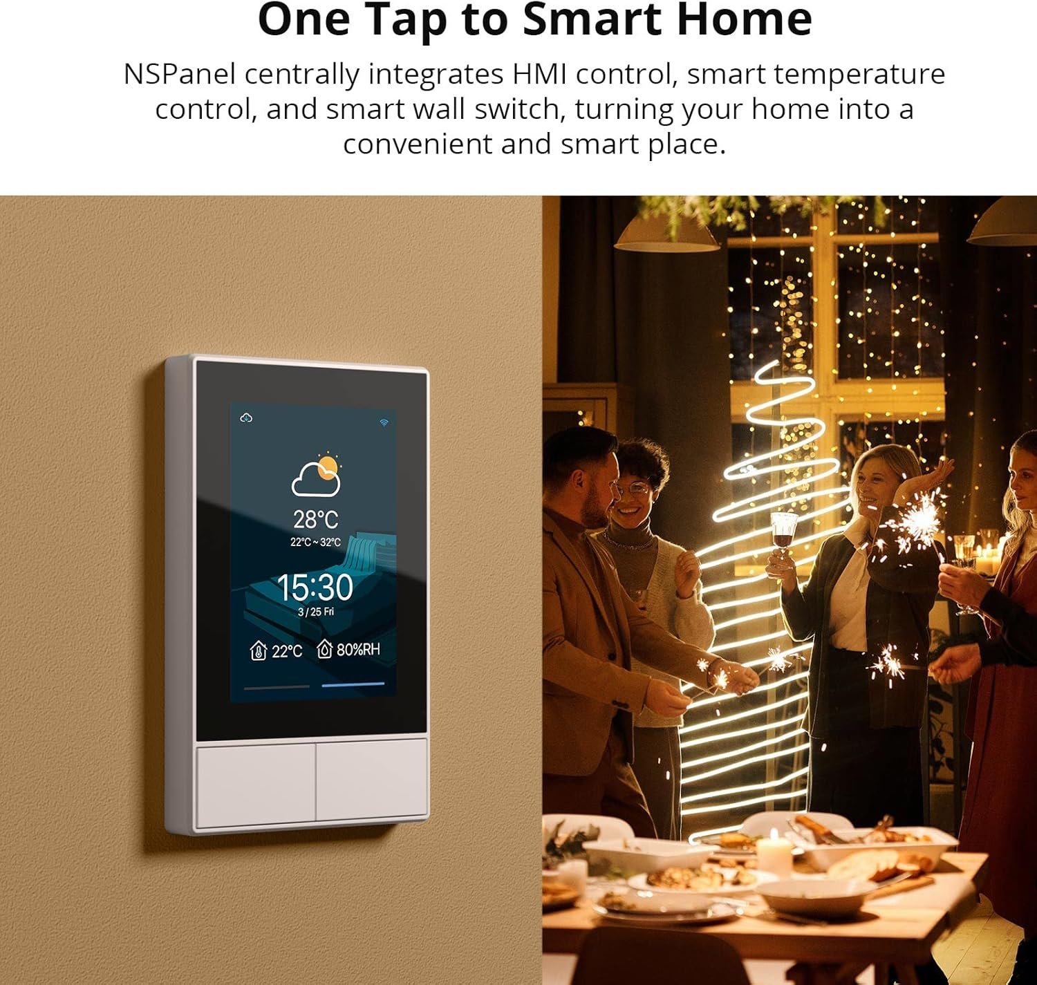 [Time and Weather Information] Equipped with built-in sensors and WiFi connectivity, the NSPanel smart scene wall switch provides real-time updates on weather, indoor and outdoor temperatures, time, and date.