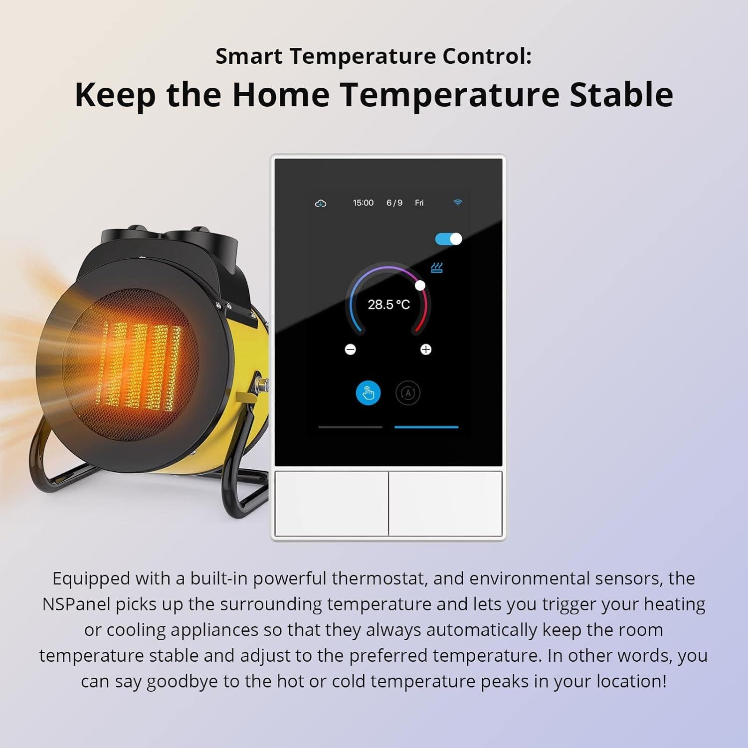 [Integrated HMI Panel and Home Automation Thermostat] Your home can become a smart, functional place with SONOFF NSPanel’s central integration of smart wall switches, HMI control, and smart temperature control. Featuring a built-in thermostat, NSPanel lets you set different temperatures for different times of the day. It automatically triggers heating or cooling systems to maintain a comfortable indoor temperature.