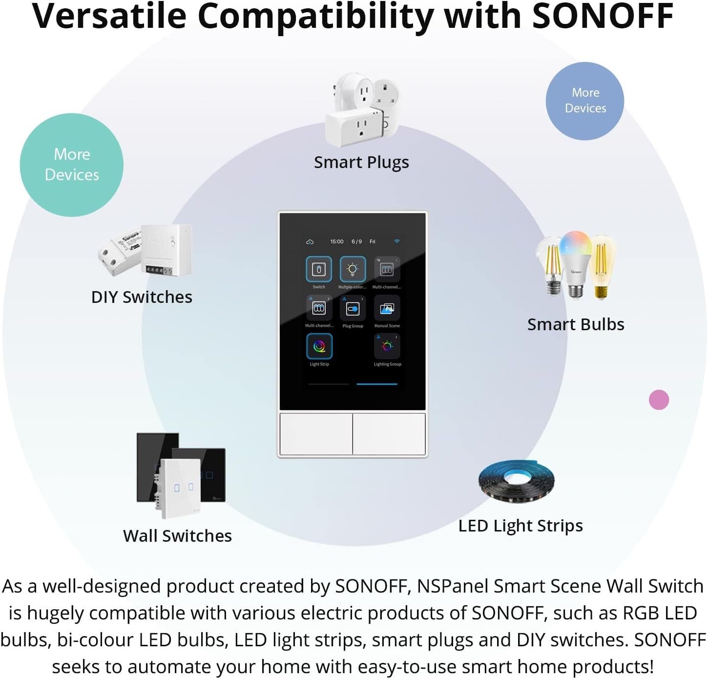 [All-in-One Control Center] NSPanel can assist you in using particular scene modes in various scenes with a single tap. Apart from the scenario-based control, it is compatible with nearly all SONOFF devices and supports central control for grouped devices.
