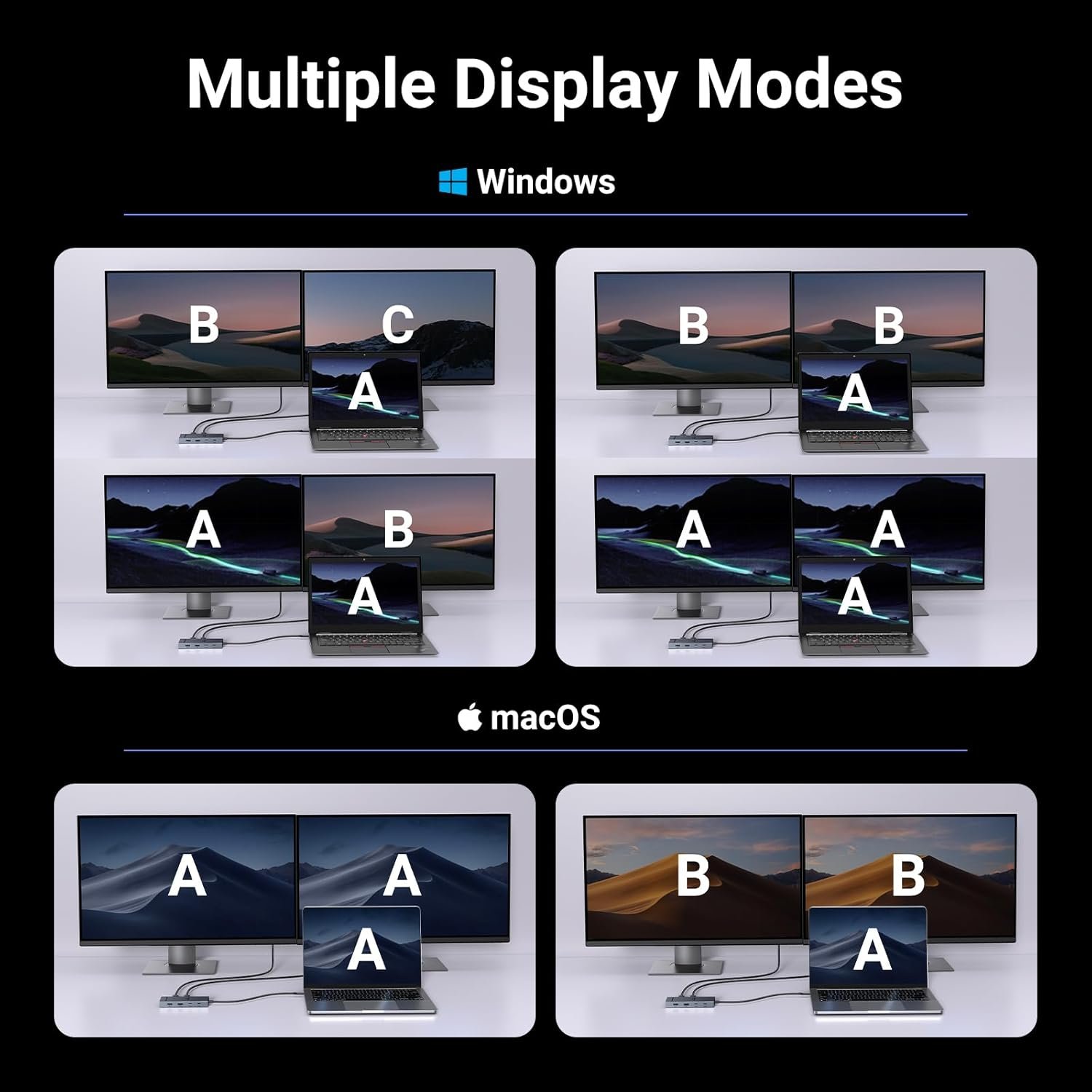 Wide Adaptability: The Type-C docking station is compatible with ThinkPad X1, ZenBook, Chromebook, Surface, etc. Note: Windows systems can utilize an extended dual-screen display, Mac devices are limited to mirror mode.If you are a Mac user and want two external monitors to display different images, we do not recommend using this dock.