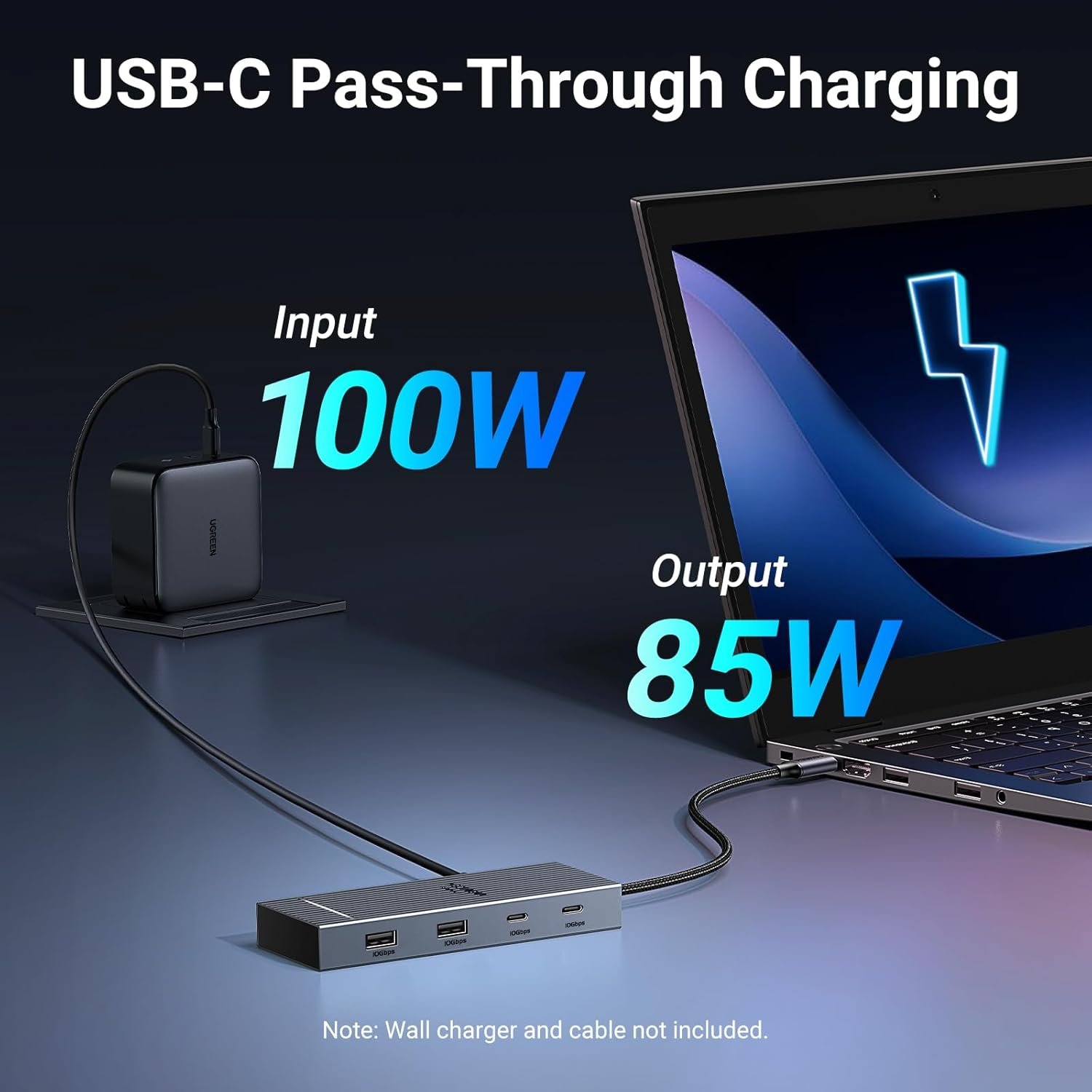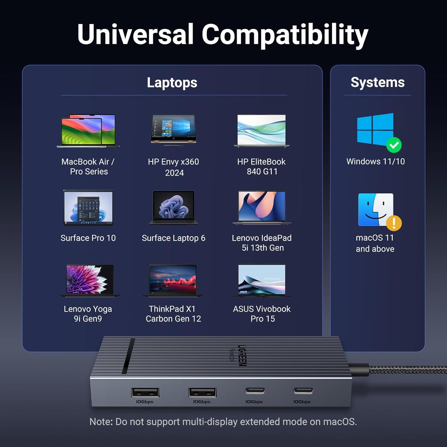 7 In 1 USB C Laptop Docking Station:UGREEN Docking station comes with 2 HDMI, two 10Gbps USB A ports, two 10Gbps USB C portsand, a PD 100w charging transfer port. To achieve the full capabilities of hub, ensure your laptop’s USB-C port is a full-function or Thunderbolt 3/4 port and Ensure that the cables you are using are compatible with the interface.