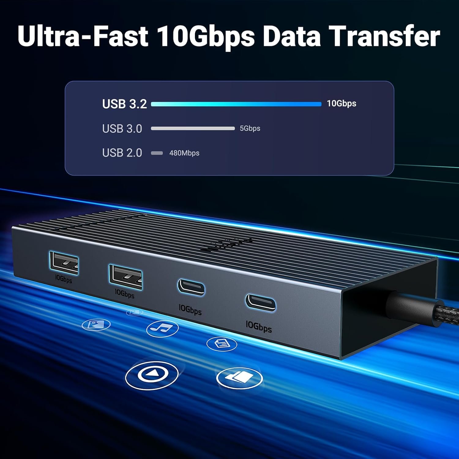 Lightning Fast Transfer Speeds: This dual HDMI USB C hub docking station comes with two USB A&C ports for connecting keyboards, mice, and transferring data in USB 3.2. Note: The 10Gbps USB A and C ports do not support charging, video or audio transfer, 10G rate requires the cable to also support 10G rate, 10G rate requires the cable to also support 10G rate.